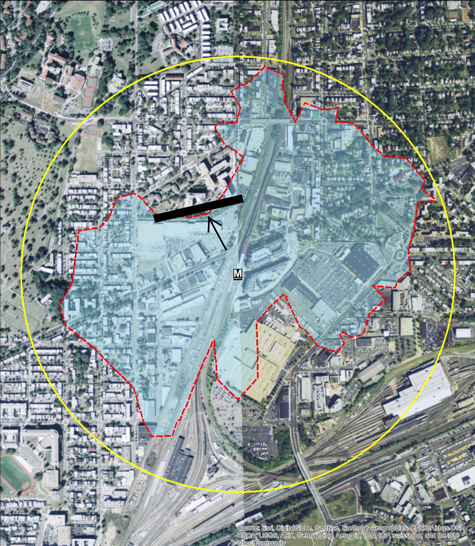 For Edgewood residents living immediately to the north, walking to the Rhode Island Avenue Metro requires a detour around the barrier that inflates the walking distance by up to half a mile - making the total walking distance a full mile or more. While some choose to make the long hike to the station, we know that people are significantly more likely to use Metro if the station is within the half-mile walk shed.