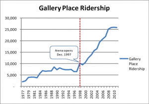 Redevelopment in the station area catalyzed by the opening of the Verizon Center in late 1997 has drastically increased the demand at this station, resulting in crowded conditions during the peak travel times throughout the station, including mezzanines, platforms and escalators. Weekday ridership has increased from an average of 6,500 boardings in 1997 to an average of 26,000 in 2011. Although ridership has stabilized over the past few years, more growth is expected in the near future with new CityCenterDC development currently under construction at the old convention center site at 10th Street and H Street NW.