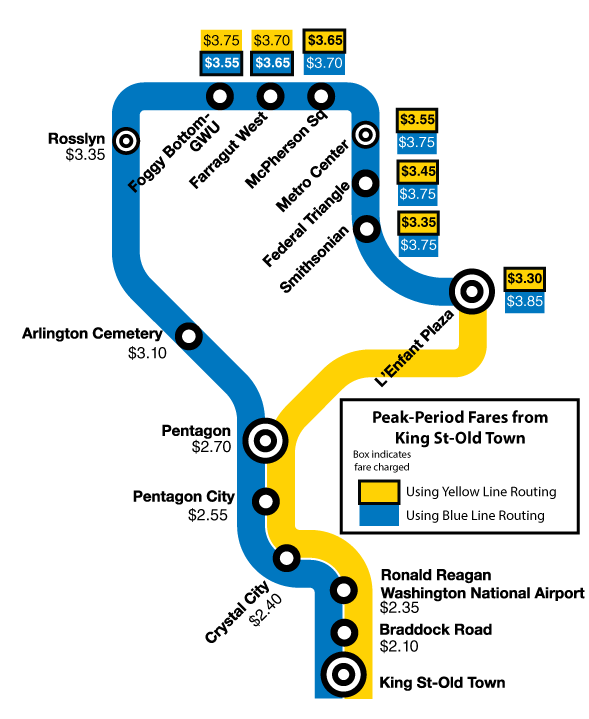 Peak-period fare calculations from King St-Old Town to downtown DC. Metro charges the fare from the least expensive routing, resulting in fares calculated using Blue Line routing for Foggy Bottom and Farragut West and the others using the Yellow Line routing.
