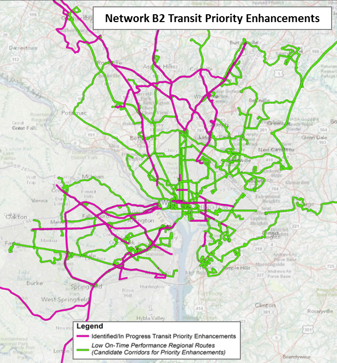 - B2: A stepped-up B1 network that decreases passenger and bus travel time and invests in transit priorities, such as queue jumps and signal priorities.