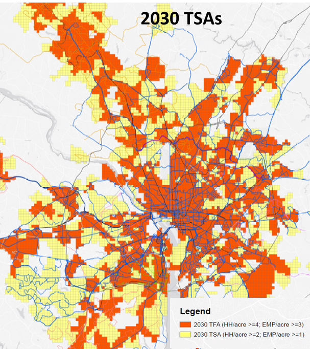 - C1: A service expansion scenario that further expands Metrobus Network A, with frequency increases and service expansion into the outer suburbs to ensure transit accessibility across the region. Transit Supportive Areas (TSAs) define the locations where transit is likely to perform the best in the future.