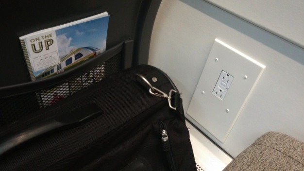 I boarded the train and looked around. It had a sort of “new train smell” to accompany its new train look. There were audio announcements, luggage racks, video screens showing station locations, tray tables and even an “in-flight magazine” and power outlets. If I didn’t know better, I would have guessed I’d just boarded another airplane and not a train. I love that they invested in all these amenities to help compete with the convenience of traveling via taxi or Uber.