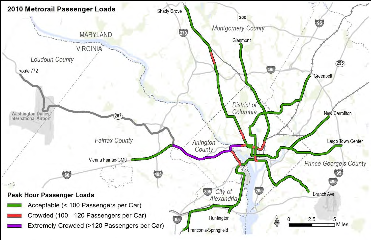 Over the past 40 years, the region has invested heavily in its transit system, but we are not using to its full capacity. Yes, there’s the Orange Crush and crowded platforms at Union Station, Gallery Place, the Farraguts and Metro Center during the peak periods. However, as shown in green on the map below, there are many many other segments and stations that are underutilized, carrying significantly fewer passengers than we have room for. This is counter-intuitive, especially since by definition crowding occurs because more riders are present, but trains are running end to end, regardless of if people board. Since rail networks, including ours, run end to end, and running the trains incurs cost, Metro’s funding partners (hint: that’s you!) pay for the service whether people are filling the seats or not. And the choice to do this year after year is costing all of us dearly.