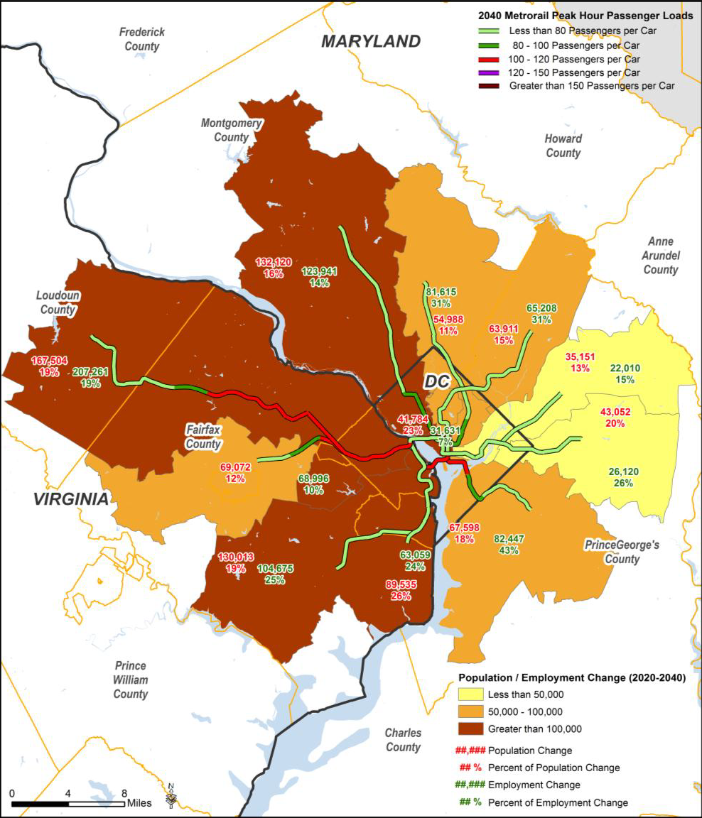 With the forecasted growth and ongoing challenges to pay for, build, and operate new infrastructure and services, Metro and regional leaders are at a crossroads, and the region has two real choices: build roads and transit to chase future land uses, which could entail addressing the crowded areas (e.g. the parts shown in red west of Rosslyn, the downtown core), while agreeing to continue to pay operating costs for the underutilized parts; OR embrace full-cost accounting by approaching development decisions as a region, supporting the location of jobs, housing, and commerce around rail stations and along bus stops and corridors where there is capacity and where we are going to pay for those trains to run, passengers or not.