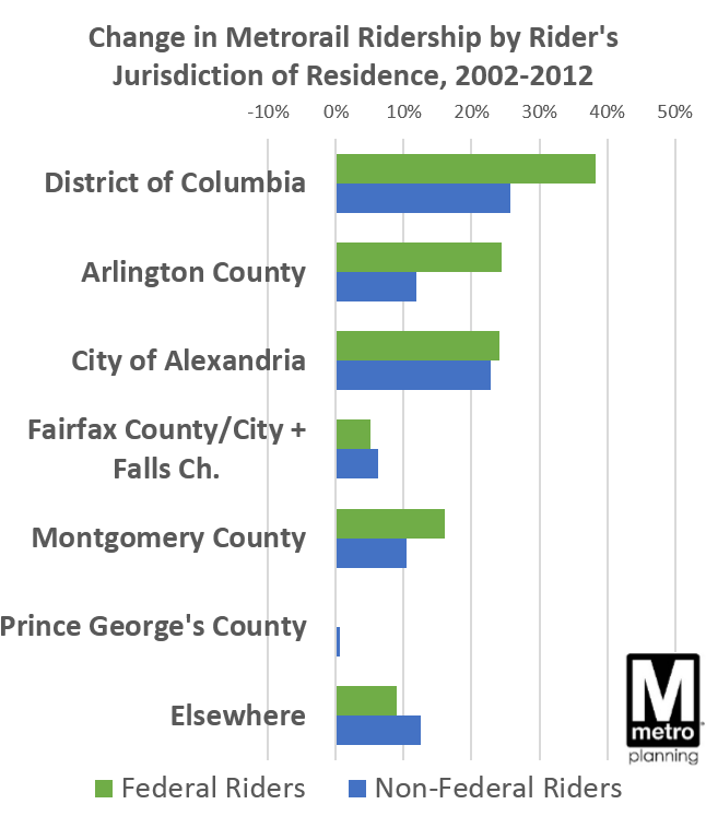 Notably, rail ridership from people living in Prince George’s County was flat between 2002 and 2012, despite the Green Line extension to Branch Ave in 2001 and the Blue Line extension to Largo in 2004.