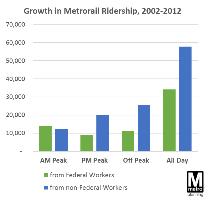 The non-federal ridership growth piques my interest in particular, as it wasn’t explored during this post. Any thoughts on why non-federal employee ridership growth has been so much higher in PM peak and off-peak?