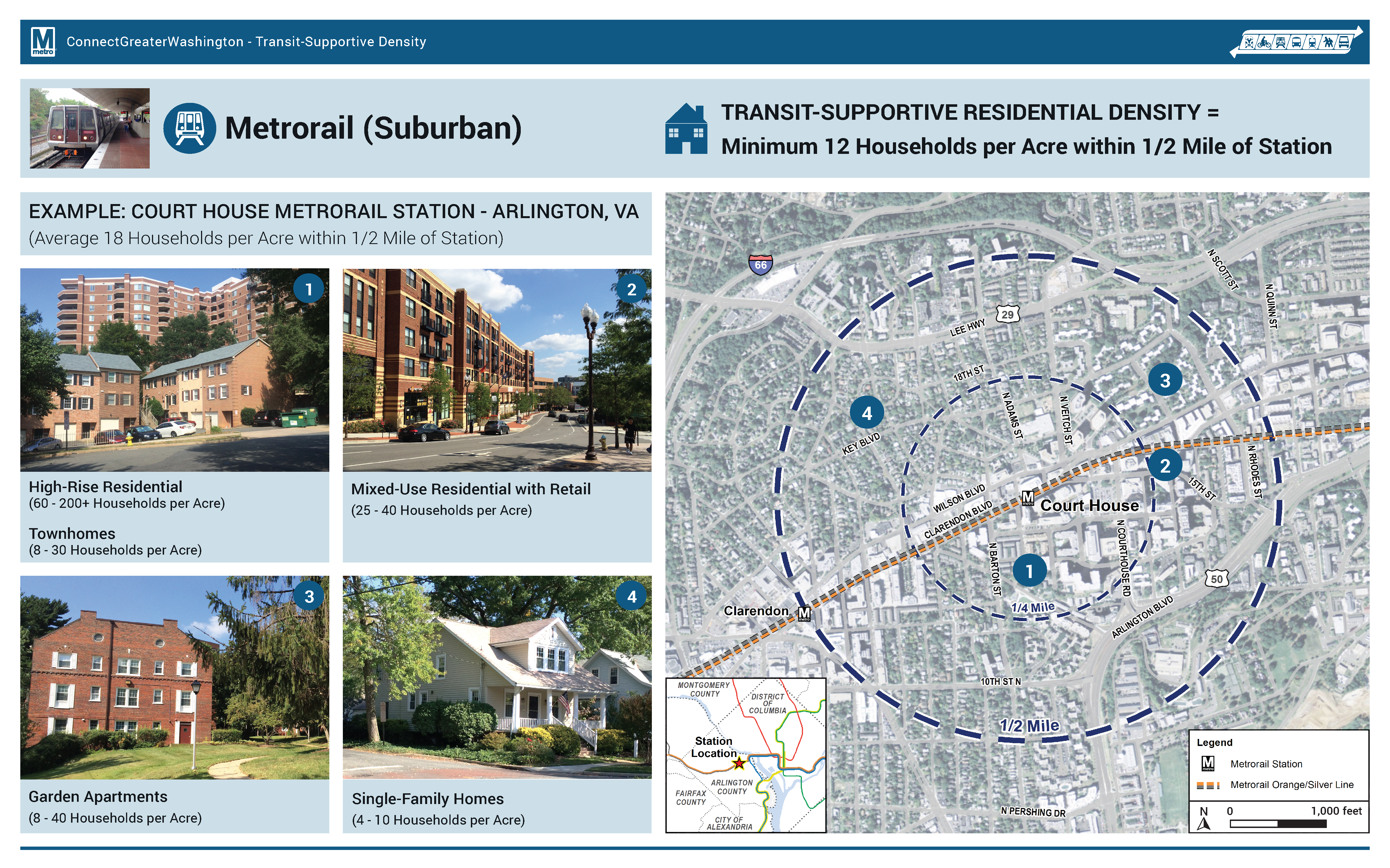 As is typical for planning projects, especially when expanding transit service along new corridors, density is discussed and jobs and/or households per acre targets are tossed around. But most people (full disclosure, that includes me) do not know what 4 households per acre or 150 jobs per acre looks like. It is especially important because a residential target of 12 households per acre within a half-mile of a suburban Metrorail station, for example, does not mean that every residential dwelling needs to meet that target. Instead, within the half-mile radius, the overall density should be 12 or more households per acre. That gives plenty of room to have less dense single family homes (on small lots) and more dense high rise apartments with studios and one-bedrooms.