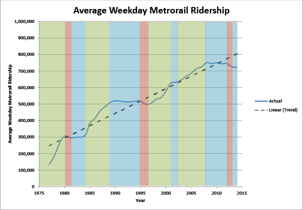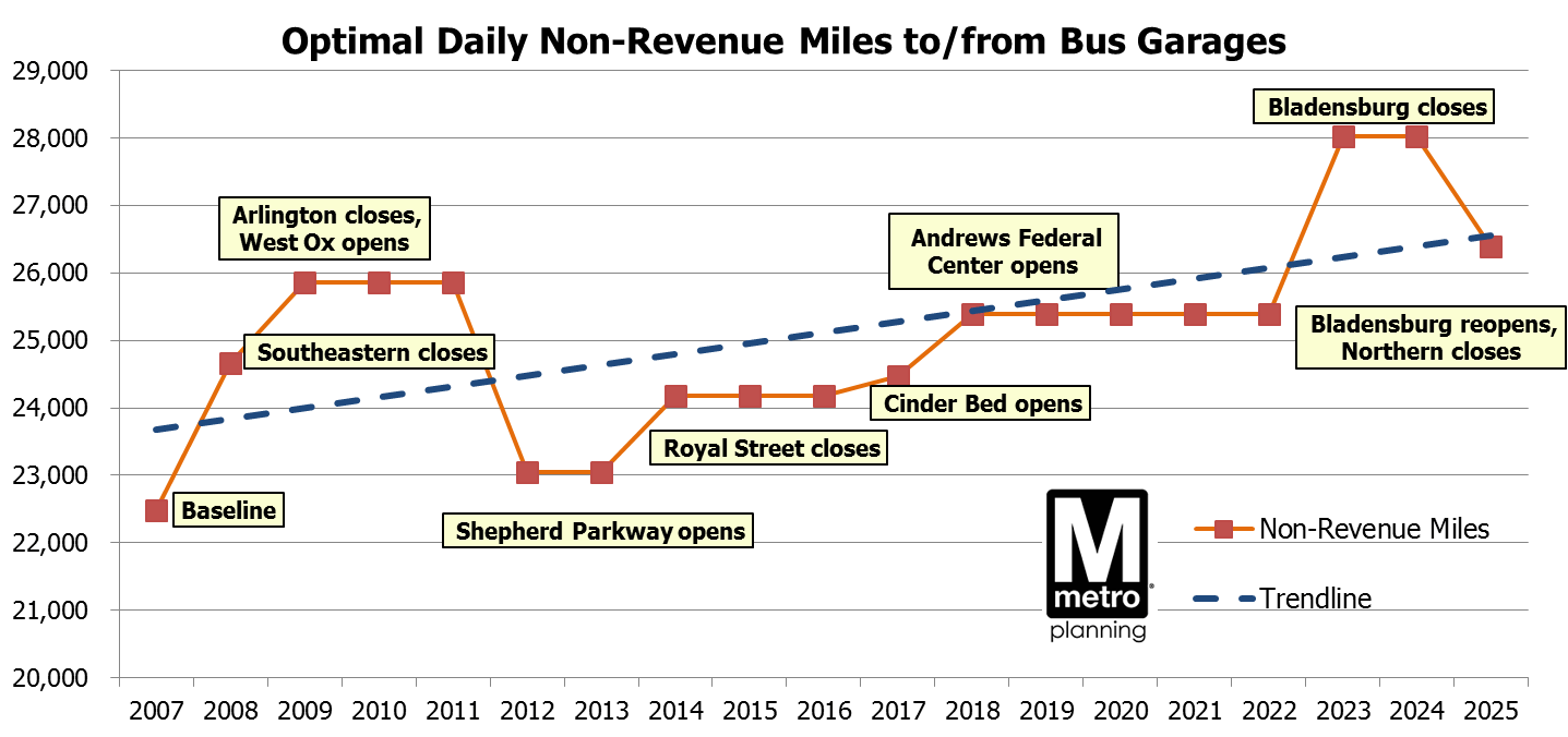 Since 2007, Metrobus’ total operating costs have increased $5 million to cover an increase of 1,700 daily deadhead miles. Closures of bus divisions have had a large impact on operations, steadily increasing daily deadhead miles from the 22,500 mile baseline. The 2008 closure of Southeastern Bus Division (now the Half Street Fairgrounds) as part of the Navy Yard/Nats Park redevelopment caused daily deadhead miles to jump nearly 2,200 miles. Most of the remaining DC garages and Southern were forced over their normal capacity limits, and some service was shifted to Montgomery Division. A year later, the World War II-era Arlington bus division closed and capacity was shifted to the new West Ox Division in Fairfax County. Shepherd Parkway Division opened in 2012, 4 years after its predecessor Southeastern closed, bringing overall deadhead miles about 600 miles shy of the 2007 baseline. Two years later, the Royal Street bus division in Alexandria closed, increasing miles once again.