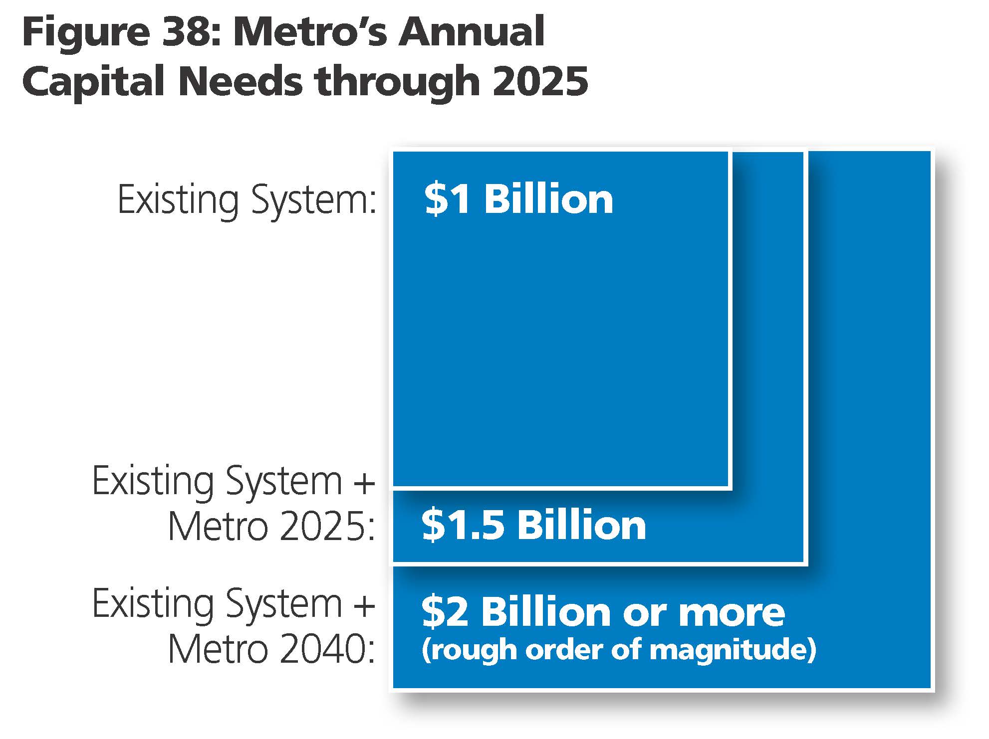 agencies, Metro must rebuild its once-new capital assets as they wear down and deteriorate after decades of use. Metro could feasibly use every penny in its capital budget for years to come just reducing its backlog of maintenance issues. Moreover, Metro also needs to ensure that the system is able to overcome the capacity constraints that come with a regional population expected to swell in both the central core and the suburbs in the years ahead. And on top of this, Metro will need to address calls for entirely new service in many areas of the region. Once Metro is rehabilitated, the system will require a stable level of investment to maintain a state of good repair as it continues to age and deteriorate. Metro estimates that $1 billion (in 2012 dollars) per year is necessary to support and maintain the existing system, even after rehabilitation. Metro 2025 will expand the core and system capacity, as well as ensure that the region’s capital investments are successful. This requires an additional $500 million, on average, in annual capital funding through 2025.