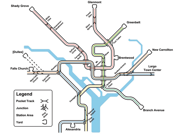 - Pocket tracks: allow trains to turn back in the direction from which they came (short-lining), gap trains to be stored until placed in revenue service, and the staging of track equipment until nighttime trackwork