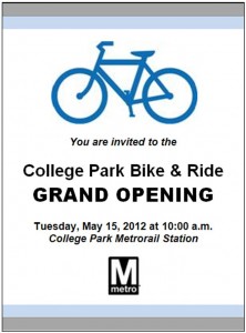 Metro will hold the grand opening event to launch its first “Bike & Ride” tomorrow - Tuesday, May 15 at 10:00am at the College Park-U of MD Metrorail station. You are invited to join us that morning, where you can hear a few words from some elected officials and Metro leaders, take a few photos, and tour the facility.