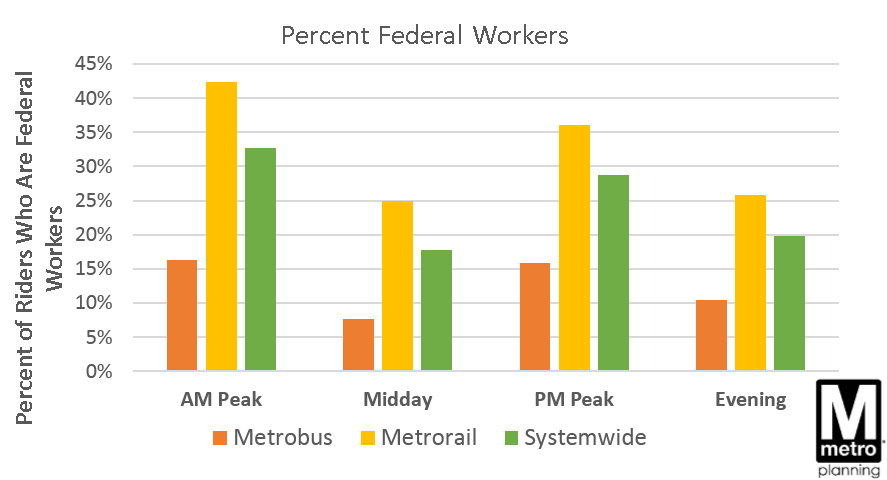 How Many, Where, and When? About 27% of all Metro weekday trips are made by federal workers - a total of 317,000 boardings across bus and rail. These federal employees can be anyone from a nurse at Walter Reed Medical Center, to a military officer at the Pentagon, to a Congressional staffer on Capitol Hill. The majority of these trips (255,000) are made on Metrorail, where federal workers make up 35% of all boardings (all-day). The remainder - just over 60,000 boardings from federal workers - happen on Metrobus, where riders are generally less likely to be federal workers (14% of all bus boardings are federal).