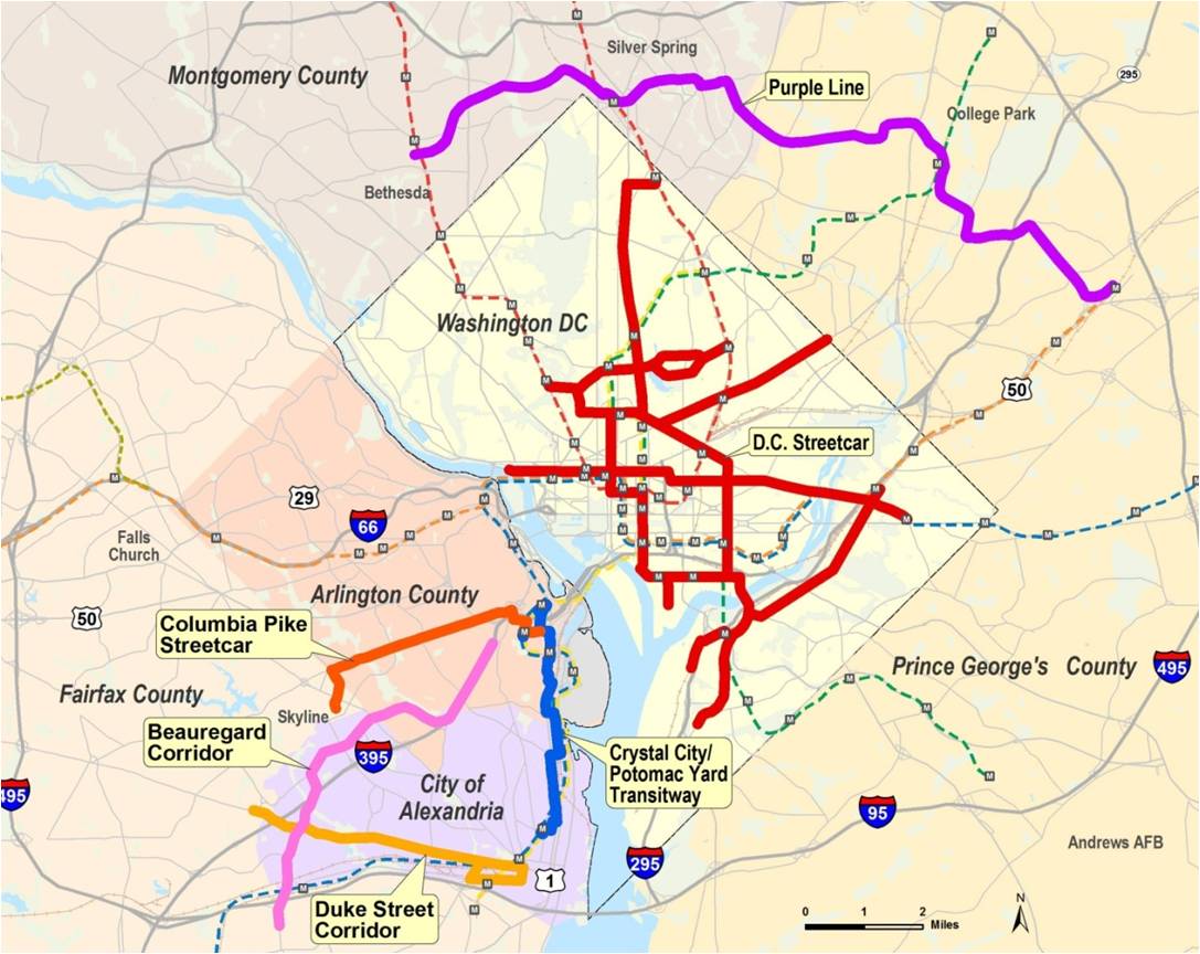 The Washington, DC metropolitan region may be the home of a light rail line and several streetcar lines in the near future according to regional plans. The state of Maryland is in the preliminary engineering phase of the Purple Line, a 16-mile light rail line that is proposed to run between Bethesda in Montgomery County to New Carrollton in Prince George’s County. The District of Columbia has almost completed construction of the H Street-Benning Road streetcar line, with scheduled revenue operation expected to begin later this year, and has also planned an expanded streetcar network. Meanwhile, Arlington and Fairfax Counties have submitted an application for federal Small Starts funding to begin project development for the Columbia Pike Streetcar line, running almost five miles from Pentagon City in Arlington to Bailey’s Crossroads in Fairfax County. Arlington County is also advancing planning for its Crystal City Streetcar project, which would run from Pentagon City, through Crystal City, to the southern Arlington County line in Potomac Yard. (The Crystal City Streetcar project can be considered a follow-up to the Crystal City Transitway project currently under construction.)