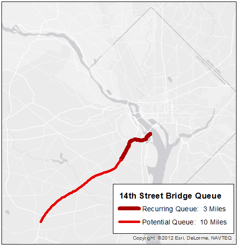 Map illustrating regularly recurring three-mile queue and the 10-mile queue that would regularly form if only 5% of the inbound AM commuters on the Yellow Line across the Potomac River switched to driving.