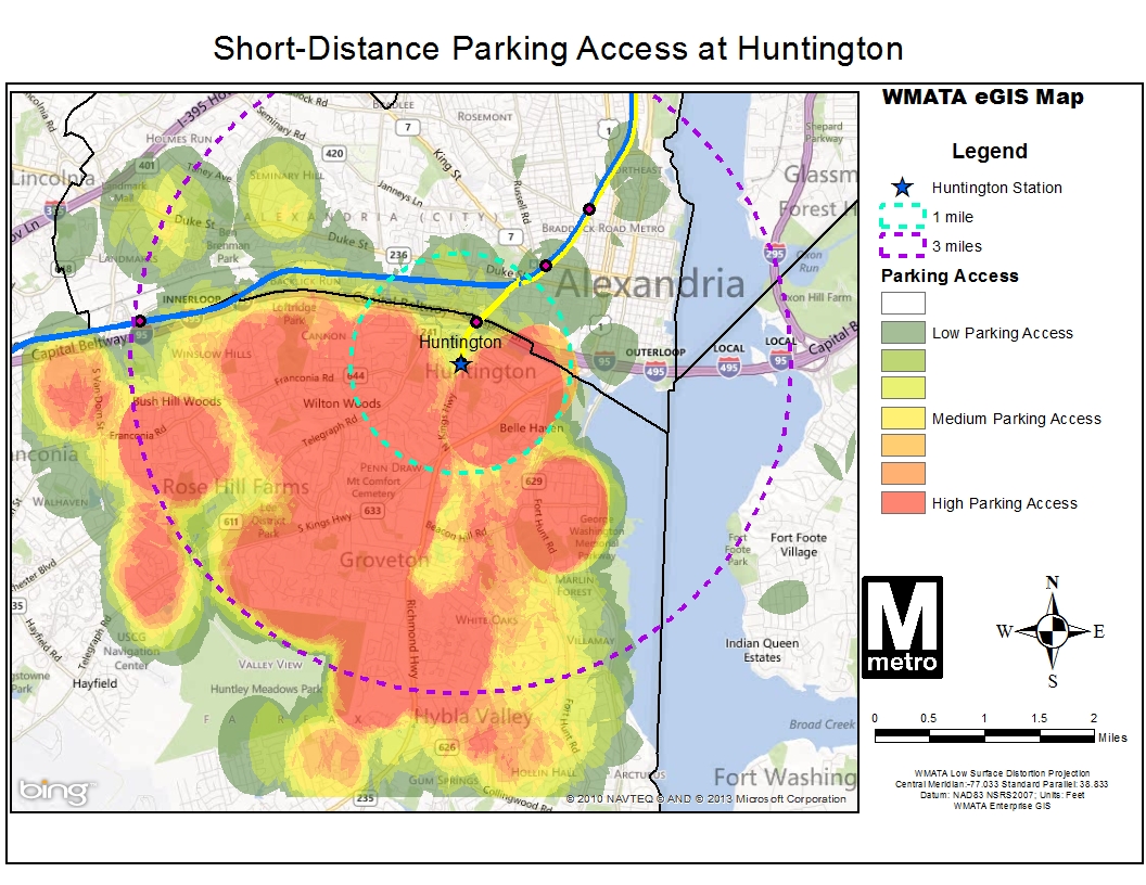 The map on the right (full version) shows auto access “hotspots” for Huntington station. Huntington is located in Alexandria Virginia less than a mile south of interstate 495, the Capital Beltway.