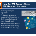 At the December 16th Transportation Planning Board (TPB) meeting (audio), Metro Board Member Harriet Tregoning gave the final presentation (pdf) and facilitated a discussion on Metro’s challenges and provided specific recommendations and/or opportunities for the TPB and local jurisdictions to increase their support the Authority today, tomorrow, and into the future. The focus of the discussion was specifically on plans, processes, and actions that the TPB and local jurisdictions can modify or begin that will ensure predictable funding and/or enhanced funding options, incorporate land use as a transportation strategy, increase transit-supportive land use decisions, prioritize bike and pedestrian access, and advance bus priority on the streets that local jurisdictions operate.